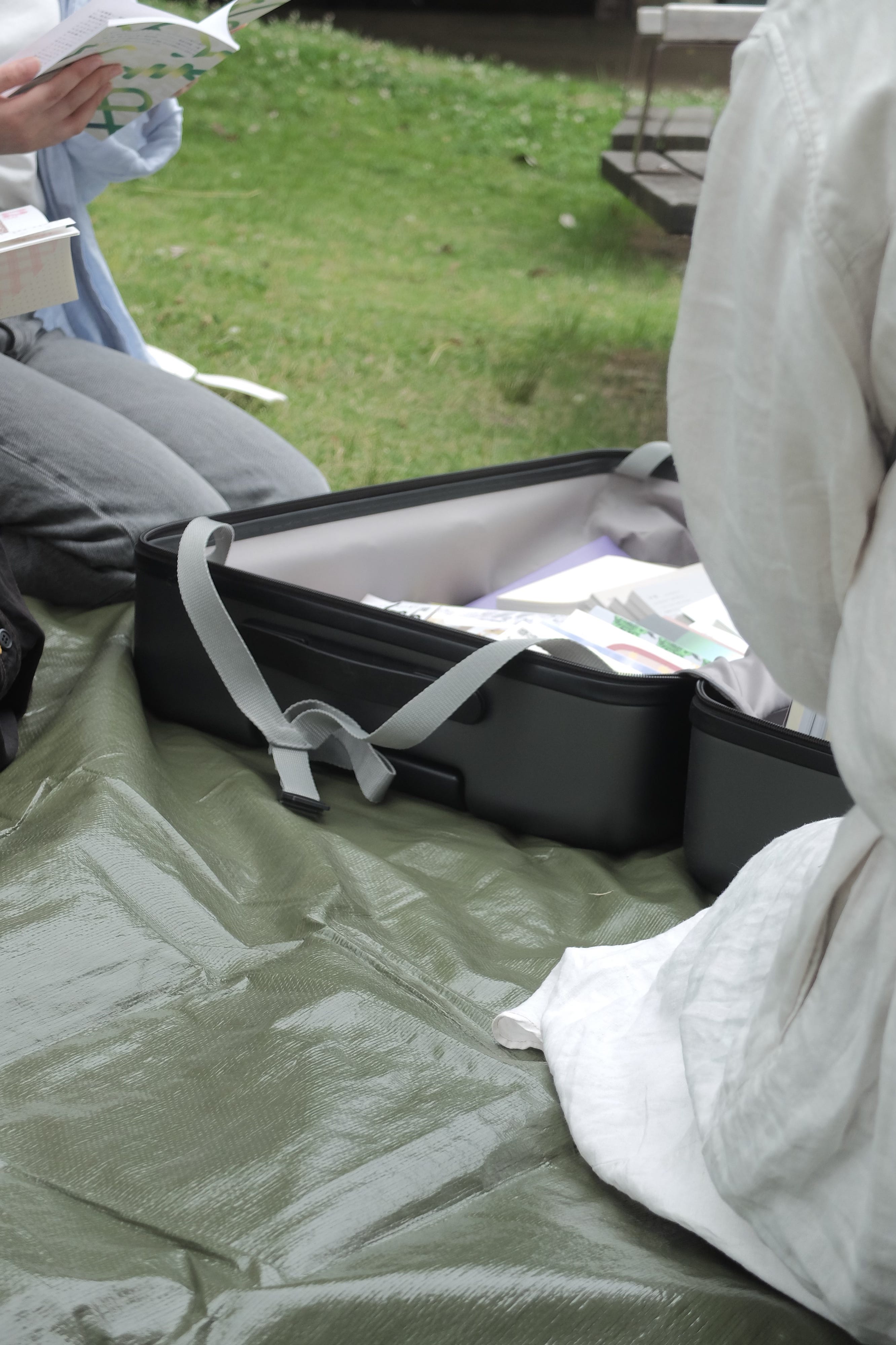 会場は、駅からのアクセスやバリアフリーを考慮して岐阜駅前の小さな緑地とし、大きめのビニールシートを芝生の上に敷いて、スーツケースに詰めてきた本やZINEを広げて販売を行った。企画側で用意したものはそれだけで、「たねをまきあう」というコンセプトを体現するべく参加者側でやりたいことやつくりたいもの、話したいことなどを持ち寄ってもらうように告知を行った。告知では会のことを、「じぶんでつくる/支配しない・されない/死なないための たねをまきあう小さな集まり」と表現し、「自作のZINEを売ったり見せたり交換したり」といった文言を告知文やサムネ画像などに盛り込みつつ、主催者側が一方的にたねを「ふるまう」のではなく、互いに「まきあう」という意図が伝わるよう工夫した。本屋メガホンとしてもこういったテーマのイベントは初めての試みになるので、中々思ったようにはいかないだろうなと考えていたが、その予想はいい意味で裏切られることになった。